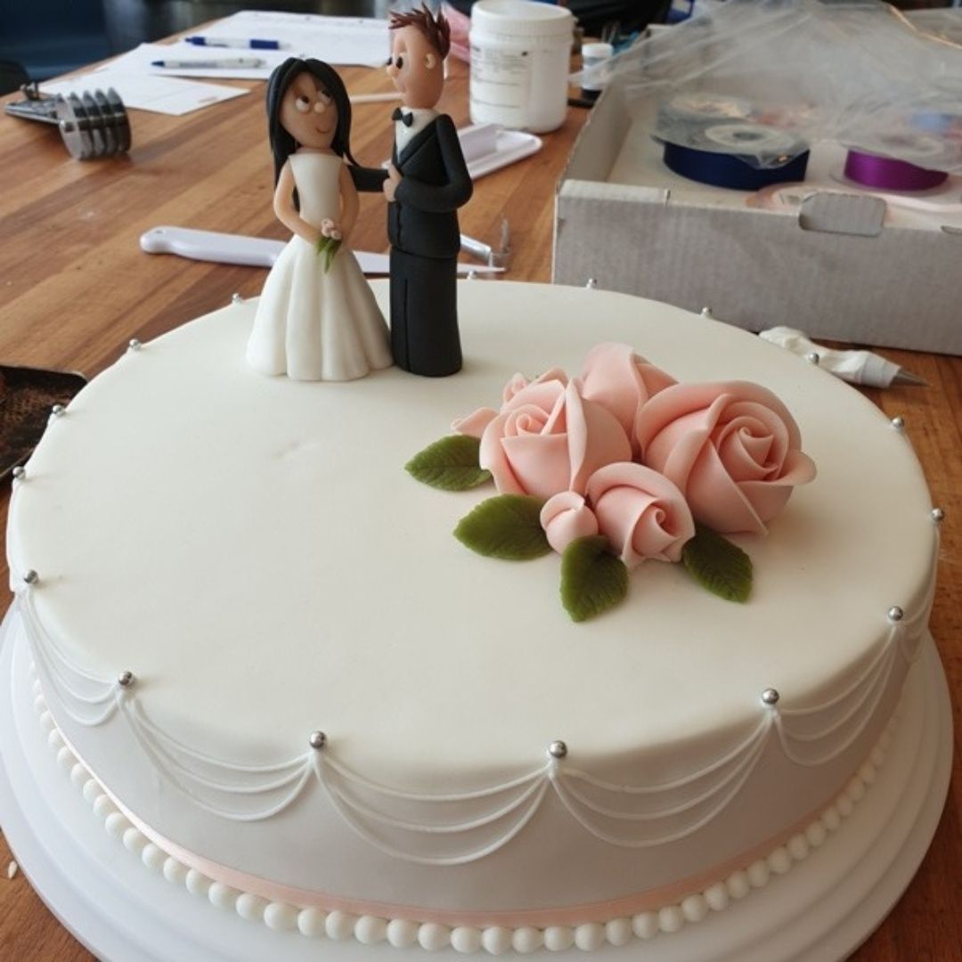En rund bryllupskage til 20pers, med fine håndsprøjtede guirlander. En lille buket roser der matcher silkebåndet for neden, og et marcipanbrudepar modelleret efter hvordan parret ser ud.