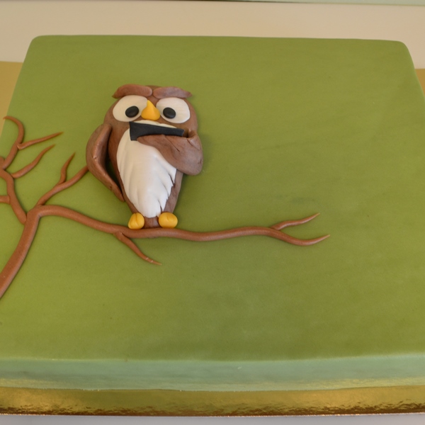 Konfirmationskage med ugle til 20 personer. Dekorationen afspejler konfirmandens interesser.