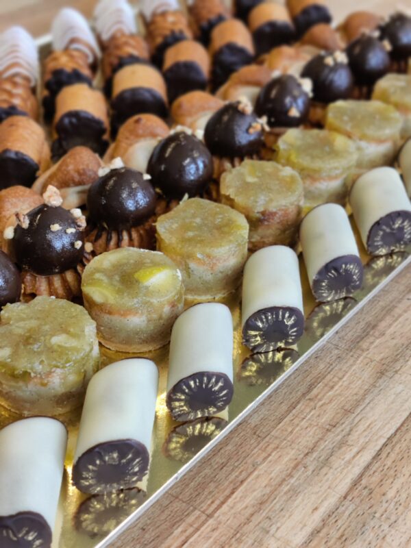 Vi anretter på guldpap og mixer i blandt vores tørkagevarianter. (kan stå på bordet hele dagen)