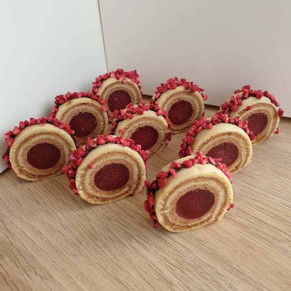 Kardemomme roulade med mørk chokolade creme og jordbær midte.